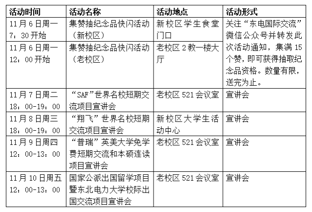 为扩大学生国际视野,为学生提供更多海外名校学习交流机会,国际合作处将于11月6日至10日举办学生出国交流项目宣讲活动周,届时将邀请项目主管详细讲解各类出国交流项目,欢迎有兴趣的在读本科生、硕博研究生参加,活动具体安排如下。